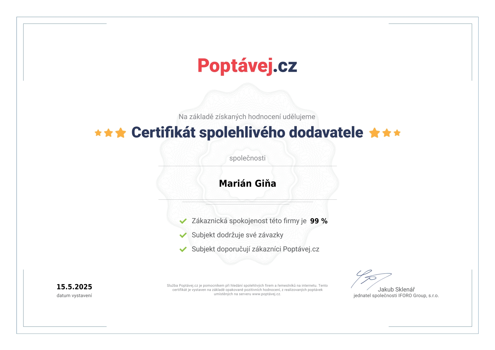 Firma obdržela certifikáty za kladná hodnocení od zákazníků na trhu práce.